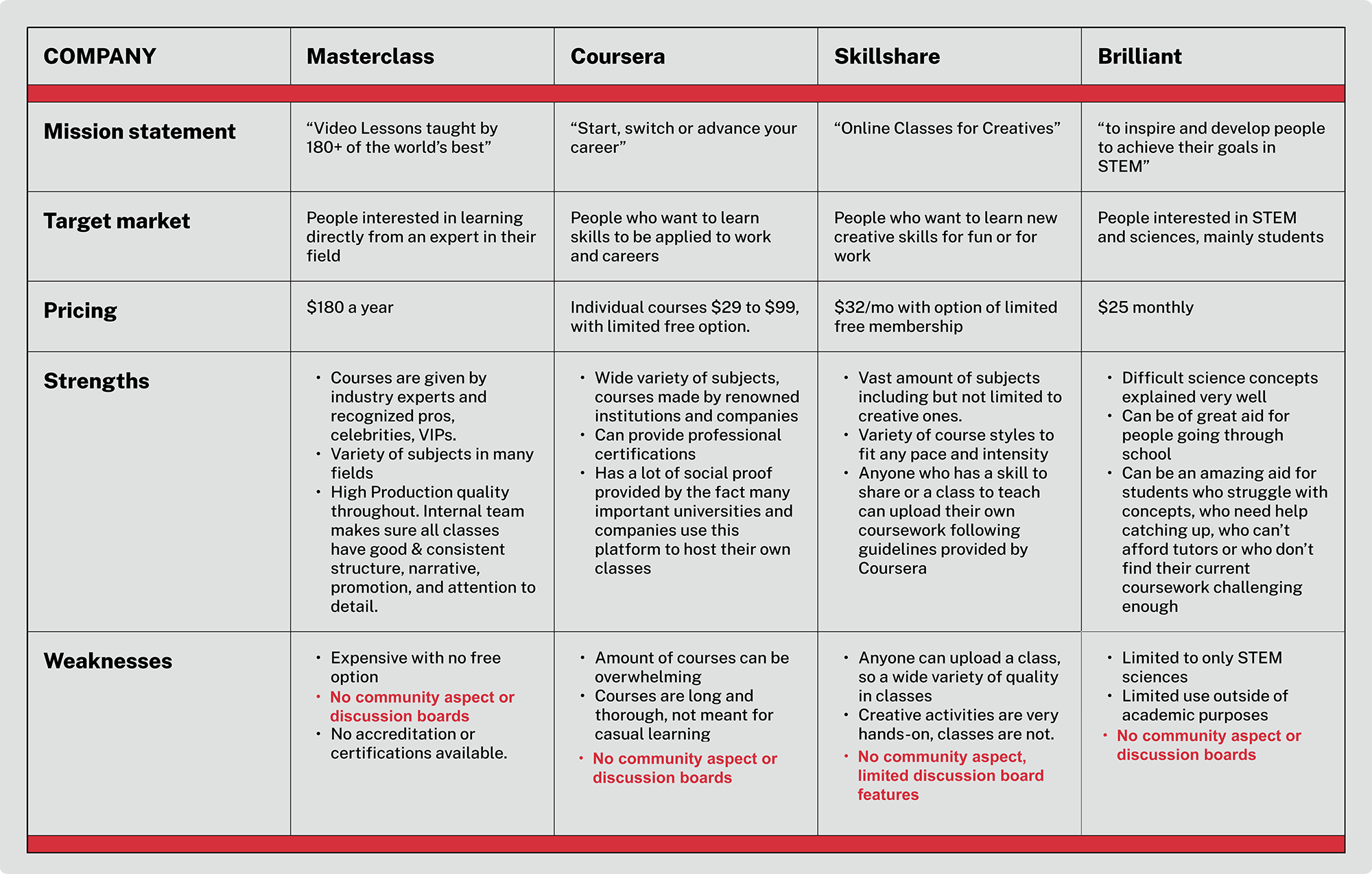 I examined the leading e-learning companies: they all cater to a defined target audience, and receive millions of monthly visits. However, none of these companies have significant community features.