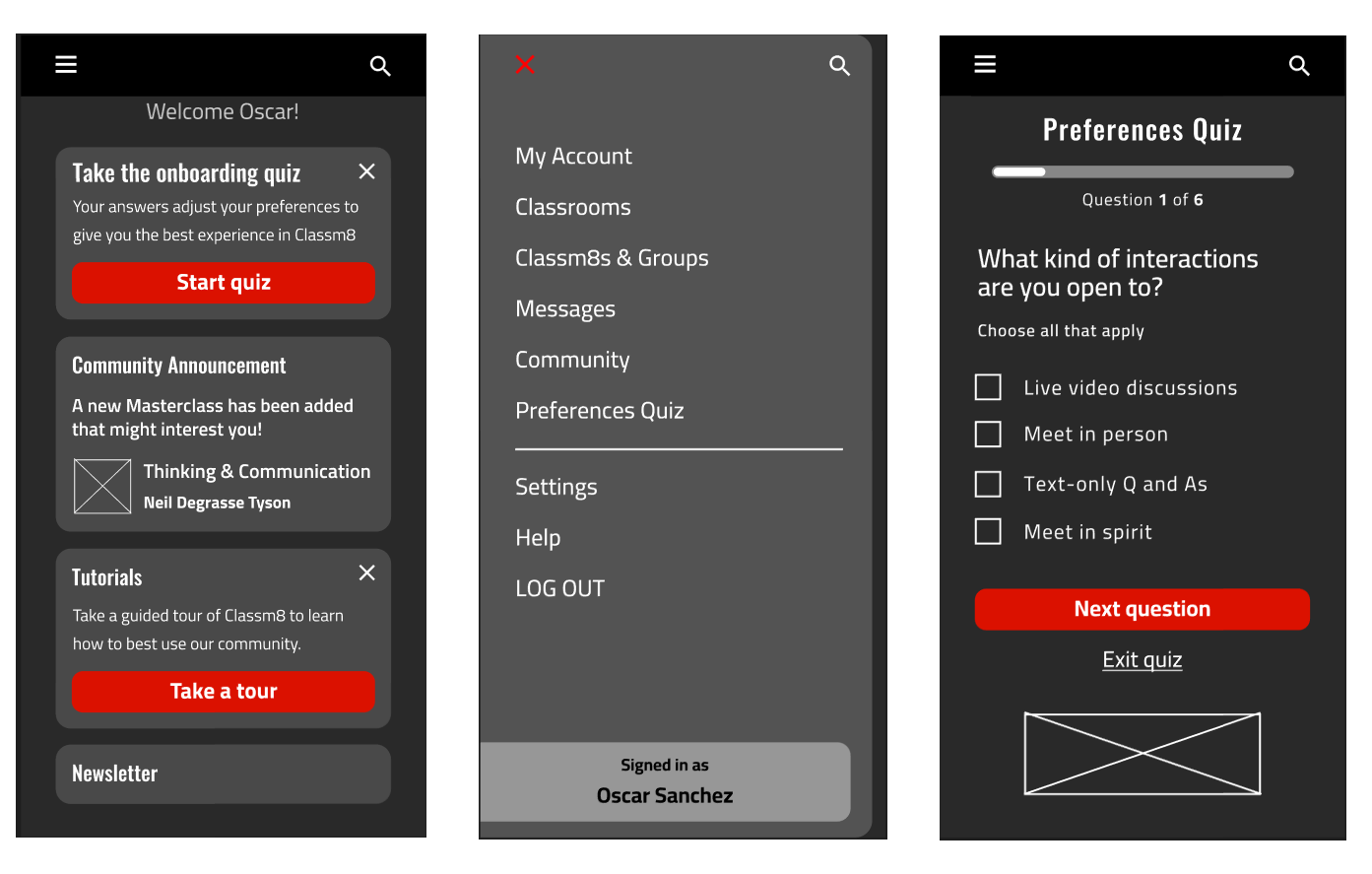 While these are all desirable features, the allotted schedule for this project allowed me to design a limited amount of screens.